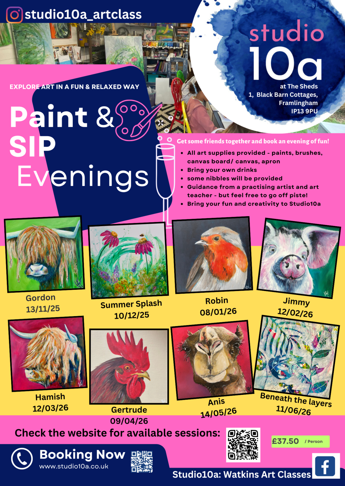 “Join us for a relaxed and creative 2.5-hour painting session at The Sheds, Framlingham. Bring your own drinks, and we’ll provide all the materials, step-by-step guidance, and plenty of fun! Using acrylic paints, you’ll create a finished artwork to take home by the end of the evening. Beginners are very welcome – it’s all about enjoying the process. Gather your friends, sip, paint, and unwind!”