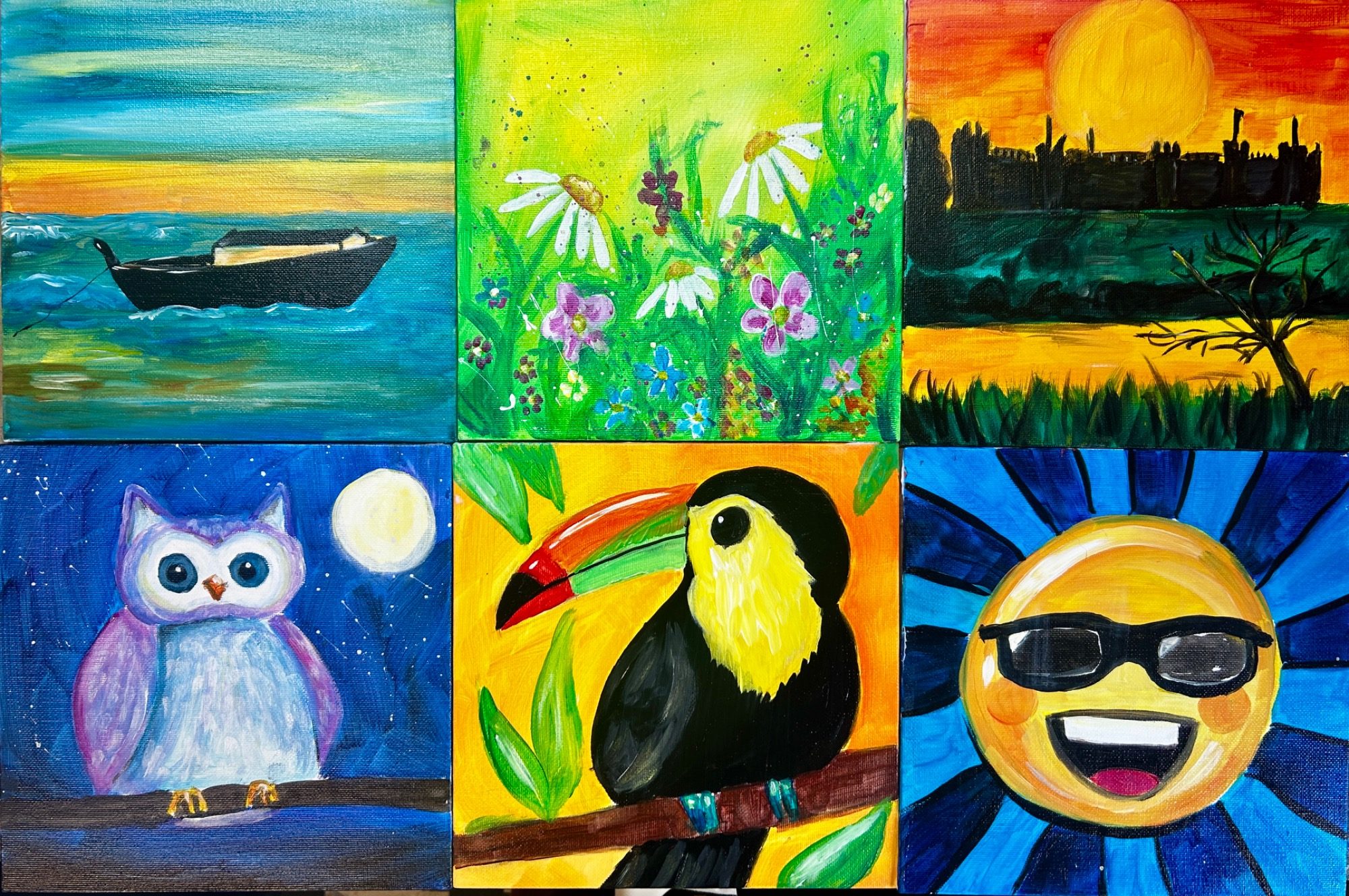 Each session lasts 1.5 hours and uses acrylic paint on canvas board, with clear, step-by-step guidance so everyone can enjoy the process and leave with a finished artwork. No previous experience is needed.